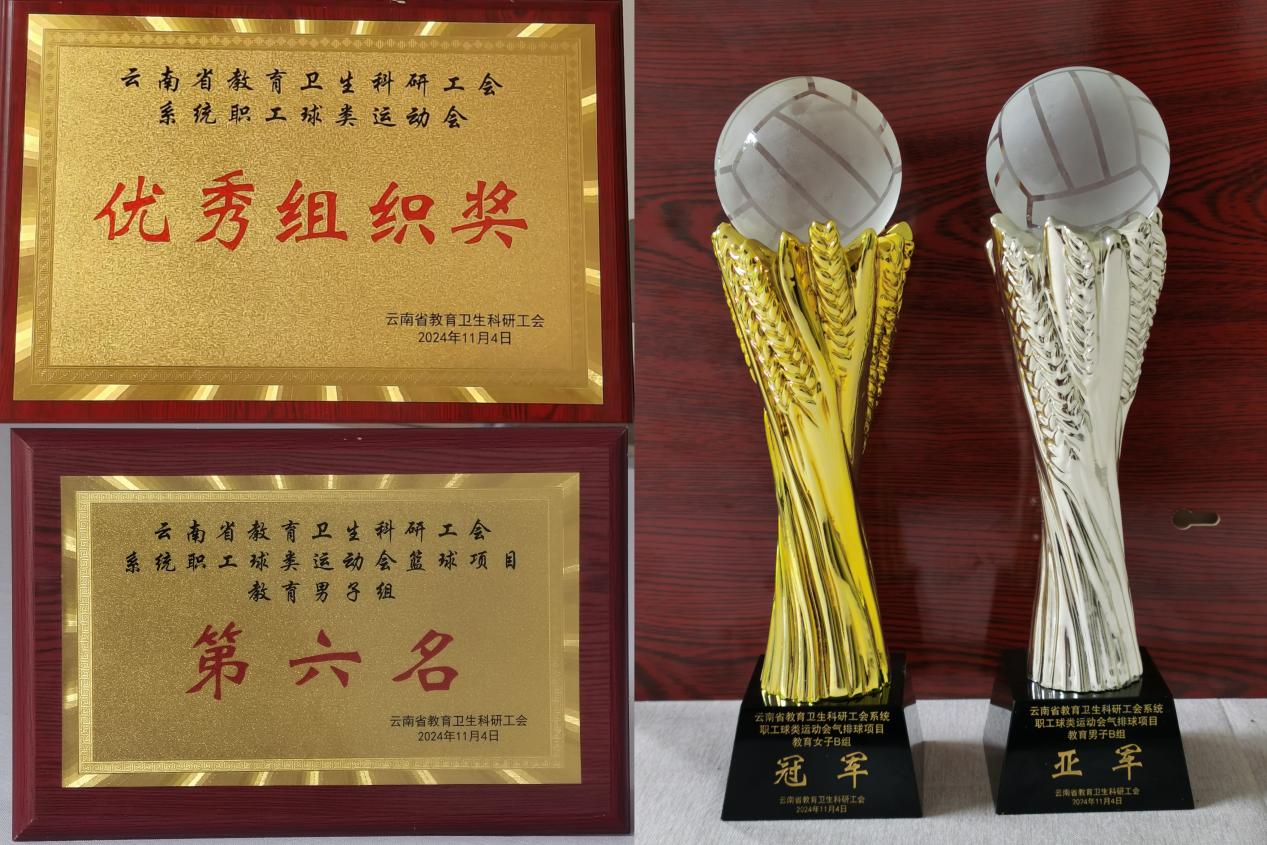 在10 月30日 至11月4日举行的 云南省教育卫生科研工会系统职工球类运动会 上,我校教职工代表队 表现出色 , 获得 气排球女子B组 冠军 、 气排球 男子 B组 亚军, 男子篮球第六名的 历史最好成绩。同时,学校荣获“优秀组织奖”,中药学院张磊、校工会郭瑜获“ 道德风尚奖”。