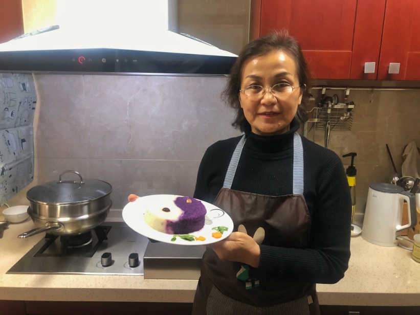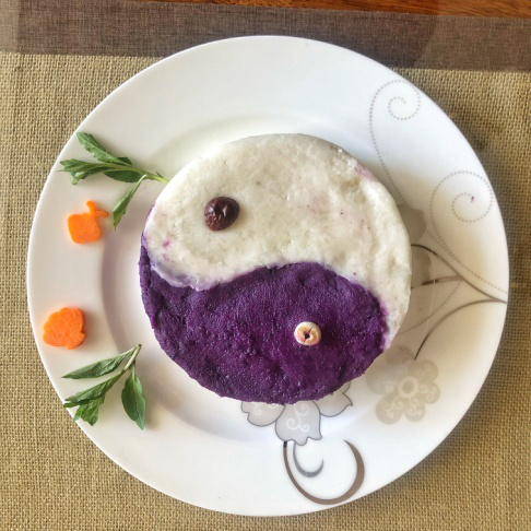 其中基础医学院杨梅老师的作品“太极山药紫薯糕”被评为最精致最具特色菜肴,作品寓意丰富,极具云中特色。这道佳肴是以山药、紫薯及茯苓为主要食材制作的精致面点,作品构图为太极阴阳图。其中,山药茯苓色白代表阳,紫薯紫黑代表阴;大枣代表阳中之阴,莲子代表阴中之阳。寓意为:阳中有阴,阴中有阳,阴极生阳,阳极生阴---阴阳平衡。食材均味甘性平,能入肺、脾、肾、心诸经。诸食材相配合,共凑健脾和胃,益气补肺,补肾填精及养心安神之功效。